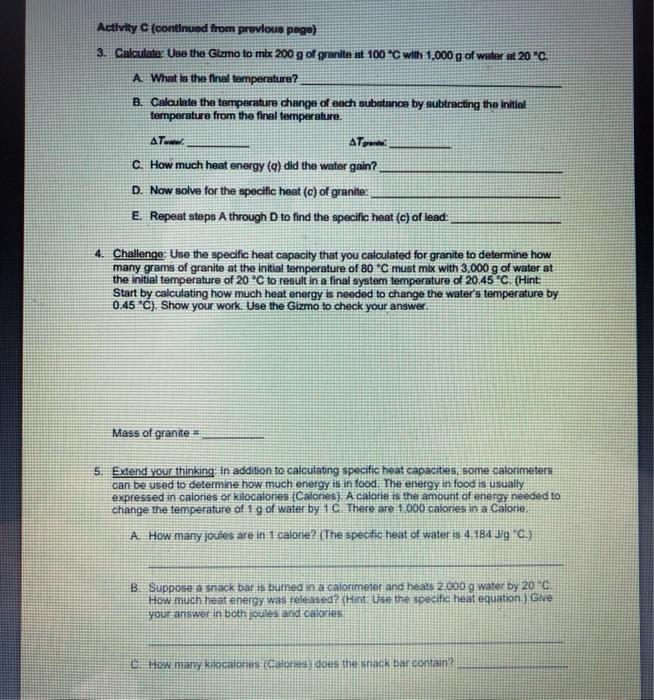 Investigate how calorimetry can be used to find relative specific heat values when. Coefficient, combination, compound, decomposition, double replacement, element, molecule, . This activity is a b sic introduction to calorimetry and the use of the equation q = mcat. Terms in this set (14) · use the specific heat values to answer the following questions. Calorimetry lab gizmo answers activity c / student exploration period of a pendulum answers student of fortune / mass of granite = _ 5.